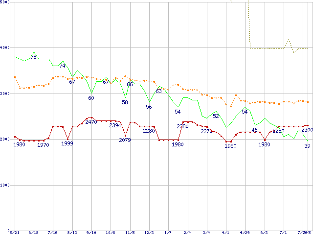 ※このグラフは過去のデータも税率5%相当に調整した税込み相当額のグラフです。 税率変更や、総額表示方式導入(2004年4月)の影響は除いています。 | | | ●凡例 | 最安値 (点線部は販売店未確認 または未調査) | 平均値 | 最高値 | ショップ数 |