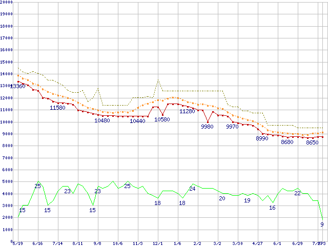 ※このグラフは過去のデータも税率5%相当に調整した税込み相当額のグラフです。 税率変更や、総額表示方式導入(2004年4月)の影響は除いています。 | | | ●凡例 | 最安値 (点線部は販売店未確認 または未調査) | 平均値 | 最高値 | ショップ数 |