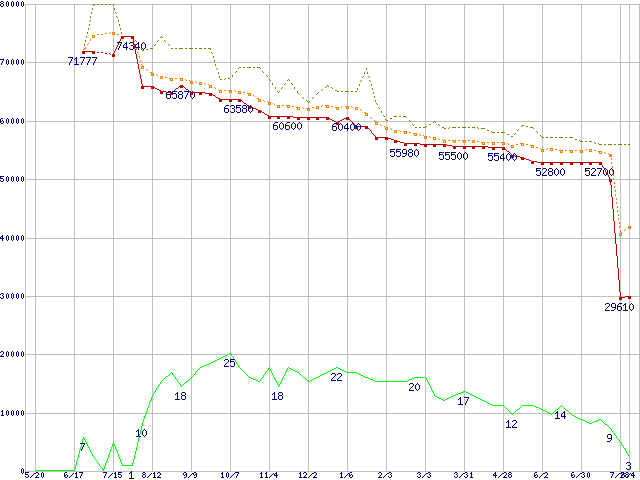 | Athlon 64 X2 4400+ (2.2GHz,L2 1MB×2,Socket 939)の価格推移 | | | (2005年5月20日~2006年8月4日) |