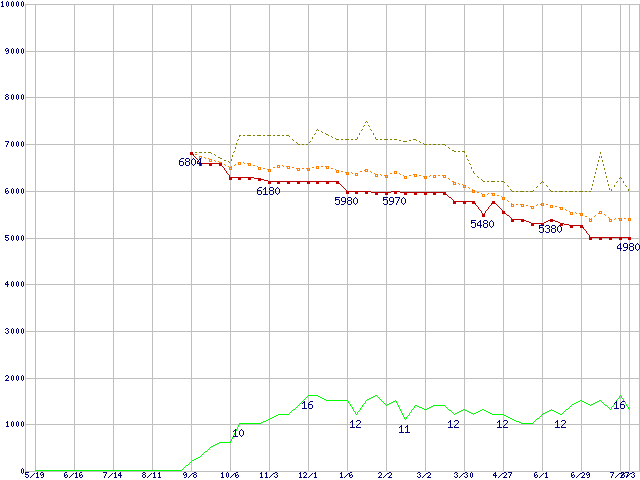 ※このグラフは過去のデータも税率5%相当に調整した税込み相当額のグラフです。 税率変更や、総額表示方式導入(2004年4月)の影響は除いています。 | | | ●凡例 | 最安値 (点線部は販売店未確認 または未調査) | 平均値 | 最高値 | ショップ数 |