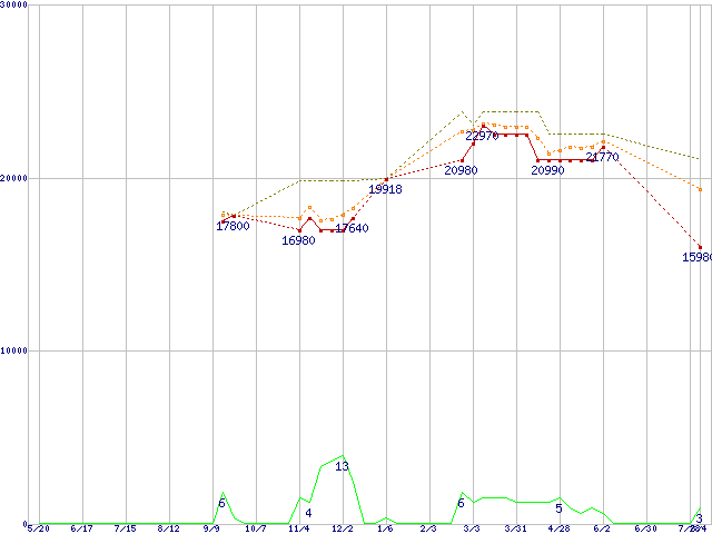 ※このグラフは過去のデータも税率5%相当に調整した税込み相当額のグラフです。 税率変更や、総額表示方式導入(2004年4月)の影響は除いています。 | | | ●凡例 | 最安値 (点線部は販売店未確認 または未調査) | 平均値 | 最高値 | ショップ数 |