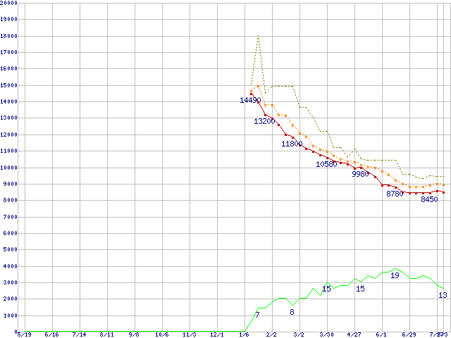 ※このグラフは過去のデータも税率5%相当に調整した税込み相当額のグラフです。 税率変更や、総額表示方式導入(2004年4月)の影響は除いています。 | | | ●凡例 | 最安値 (点線部は販売店未確認 または未調査) | 平均値 | 最高値 | ショップ数 |