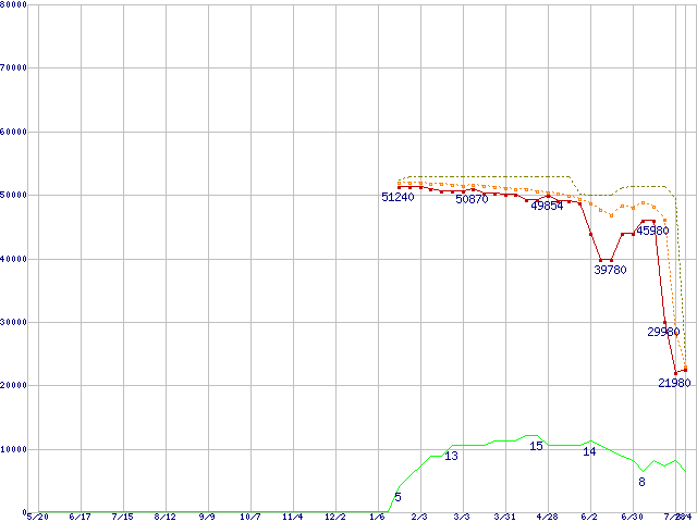※このグラフは過去のデータも税率5%相当に調整した税込み相当額のグラフです。 税率変更や、総額表示方式導入(2004年4月)の影響は除いています。 | | | ●凡例 | 最安値 (点線部は販売店未確認 または未調査) | 平均値 | 最高値 | ショップ数 |