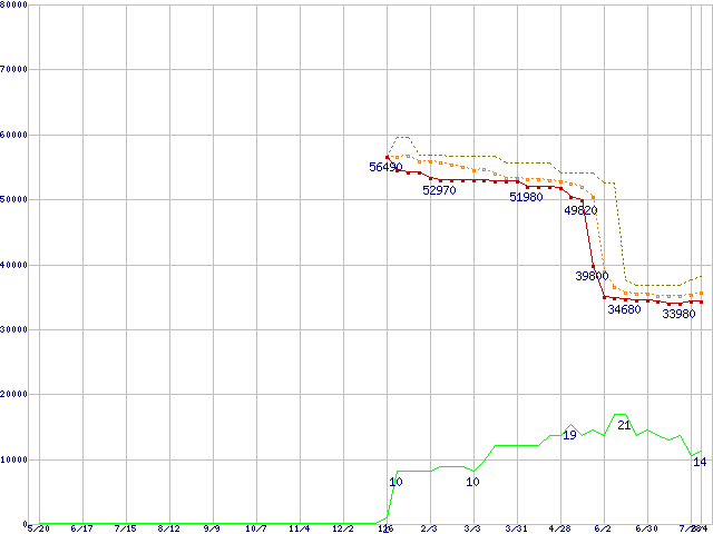 ※このグラフは過去のデータも税率5%相当に調整した税込み相当額のグラフです。 税率変更や、総額表示方式導入(2004年4月)の影響は除いています。 | | | ●凡例 | 最安値 (点線部は販売店未確認 または未調査) | 平均値 | 最高値 | ショップ数 |