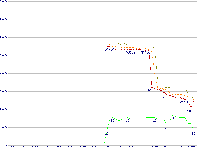 ※このグラフは過去のデータも税率5%相当に調整した税込み相当額のグラフです。 税率変更や、総額表示方式導入(2004年4月)の影響は除いています。 | | | ●凡例 | 最安値 (点線部は販売店未確認 または未調査) | 平均値 | 最高値 | ショップ数 |