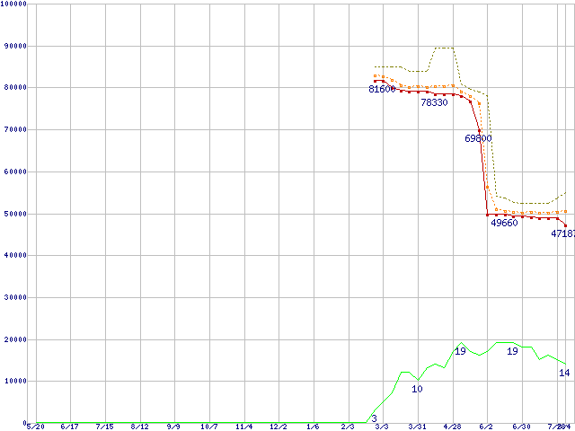 ※このグラフは過去のデータも税率5%相当に調整した税込み相当額のグラフです。 税率変更や、総額表示方式導入(2004年4月)の影響は除いています。 | | | ●凡例 | 最安値 (点線部は販売店未確認 または未調査) | 平均値 | 最高値 | ショップ数 |
