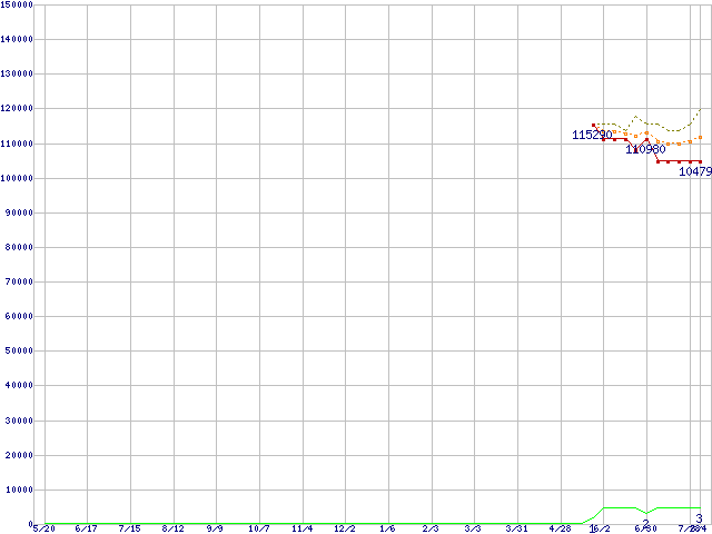 ※このグラフは過去のデータも税率5%相当に調整した税込み相当額のグラフです。 税率変更や、総額表示方式導入(2004年4月)の影響は除いています。 | | | ●凡例 | 最安値 (点線部は販売店未確認 または未調査) | 平均値 | 最高値 | ショップ数 |