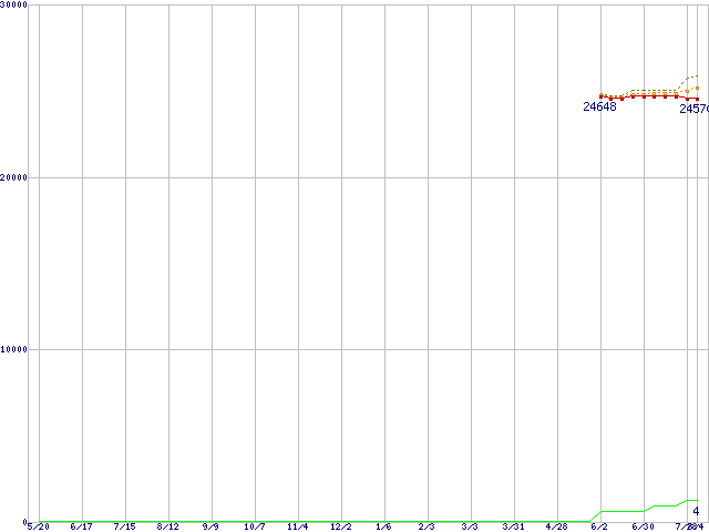 ※このグラフは過去のデータも税率5%相当に調整した税込み相当額のグラフです。 税率変更や、総額表示方式導入(2004年4月)の影響は除いています。 | | | ●凡例 | 最安値 (点線部は販売店未確認 または未調査) | 平均値 | 最高値 | ショップ数 |