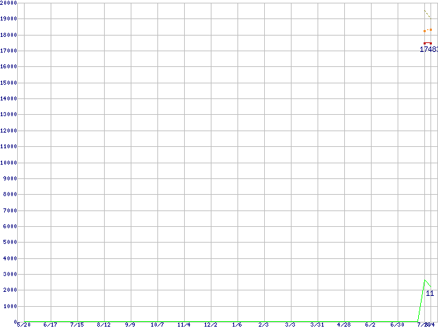 ※このグラフは過去のデータも税率5%相当に調整した税込み相当額のグラフです。 税率変更や、総額表示方式導入(2004年4月)の影響は除いています。 | | | ●凡例 | 最安値 (点線部は販売店未確認 または未調査) | 平均値 | 最高値 | ショップ数 |