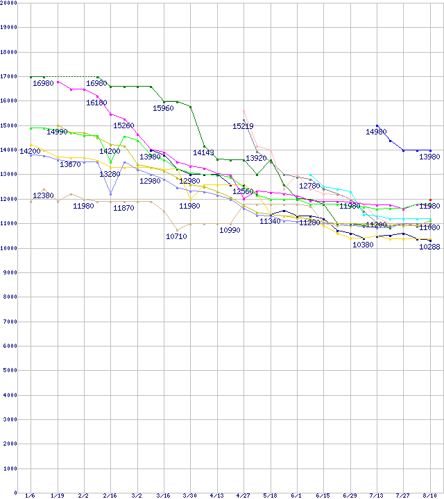 HDD主要製品(最安値1万5千円~2万円未満)の最安値推移