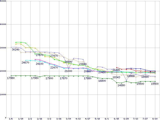 HDD主要製品(最安値1万5千円~2万円未満)の最安値推移