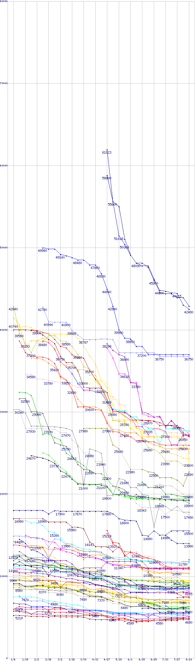 [前グラフ]:HDD主要製品(最安値2万円以上)の最安値推移