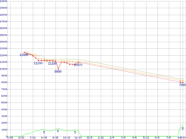 ※このグラフは過去のデータも税率5%相当に調整した税込み相当額のグラフです。 税率変更や、総額表示方式導入(2004年4月)の影響は除いています。 | | | ●凡例 | 最安値 (点線部は販売店未確認 または未調査) | 平均値 | 最高値 | ショップ数 |