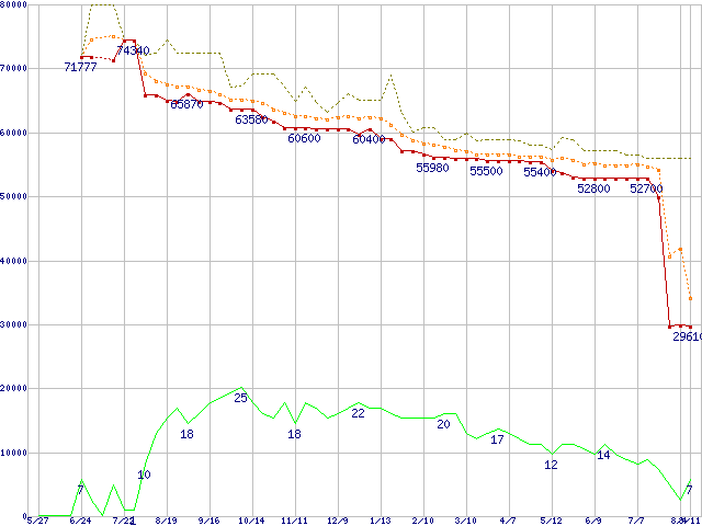| Athlon 64 X2 4400+ (2.2GHz,L2 1MB×2,Socket 939)の価格推移 | | | (2005年5月27日~2006年8月11日) |
