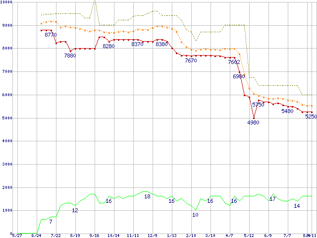 ※このグラフは過去のデータも税率5%相当に調整した税込み相当額のグラフです。 税率変更や、総額表示方式導入(2004年4月)の影響は除いています。 | | | ●凡例 | 最安値 (点線部は販売店未確認 または未調査) | 平均値 | 最高値 | ショップ数 |