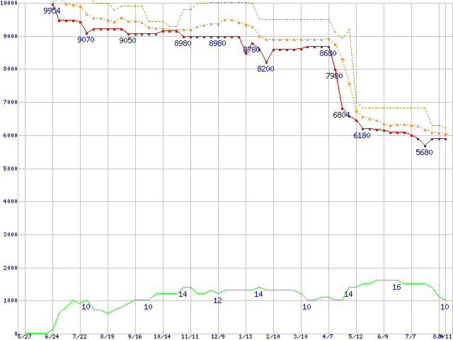 ※このグラフは過去のデータも税率5%相当に調整した税込み相当額のグラフです。 税率変更や、総額表示方式導入(2004年4月)の影響は除いています。 | | | ●凡例 | 最安値 (点線部は販売店未確認 または未調査) | 平均値 | 最高値 | ショップ数 |