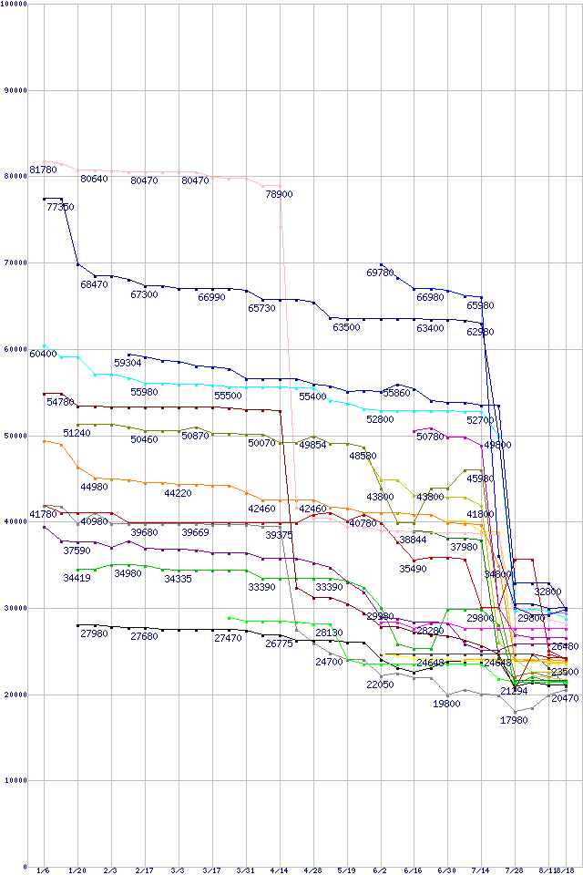 | CPU主要製品(最安値2万円~3万円未満)の最安値推移 | | | (2006年1月6日~2006年8月18日) |