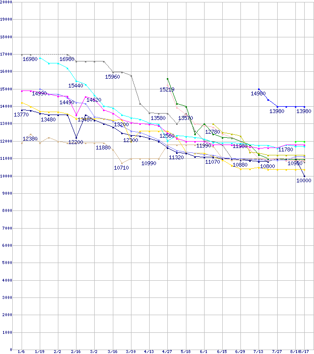 HDD主要製品(最安値1万5千円~2万円未満)の最安値推移