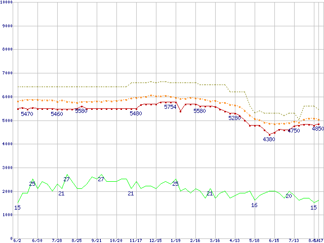 | HDS728080PLAT20 (80GB,2MB)の価格推移 | | | (2005年6月2日~2006年8月17日) |