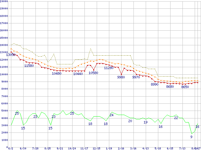 ※このグラフは過去のデータも税率5%相当に調整した税込み相当額のグラフです。 税率変更や、総額表示方式導入(2004年4月)の影響は除いています。 | | | ●凡例 | 最安値 (点線部は販売店未確認 または未調査) | 平均値 | 最高値 | ショップ数 |