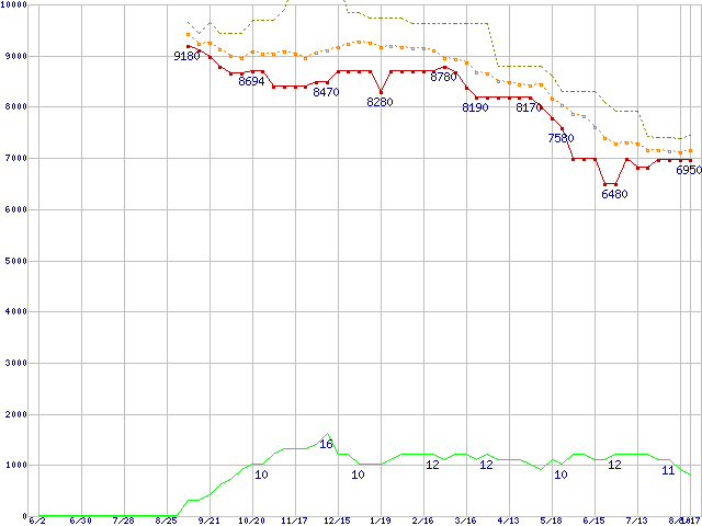 ※このグラフは過去のデータも税率5%相当に調整した税込み相当額のグラフです。 税率変更や、総額表示方式導入(2004年4月)の影響は除いています。 | | | ●凡例 | 最安値 (点線部は販売店未確認 または未調査) | 平均値 | 最高値 | ショップ数 |