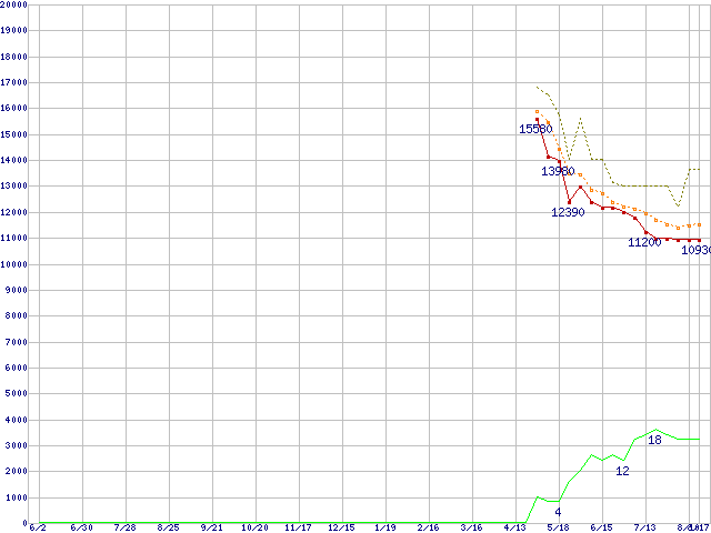 ※このグラフは過去のデータも税率5%相当に調整した税込み相当額のグラフです。 税率変更や、総額表示方式導入(2004年4月)の影響は除いています。 | | | ●凡例 | 最安値 (点線部は販売店未確認 または未調査) | 平均値 | 最高値 | ショップ数 |