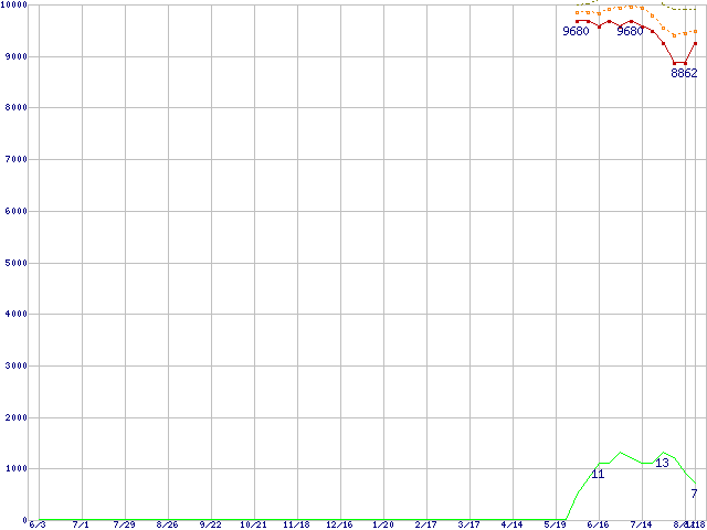 ※このグラフは過去のデータも税率5%相当に調整した税込み相当額のグラフです。 税率変更や、総額表示方式導入(2004年4月)の影響は除いています。 | | | ●凡例 | 最安値 (点線部は販売店未確認 または未調査) | 平均値 | 最高値 | ショップ数 |