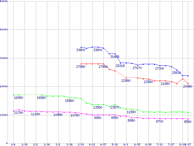 | WD Caviar SE16 (7200rpm,Serial ATA II/3Gbps,16MB)の最安値推移 | | | (2006年1月6日~2006年8月17日) |
