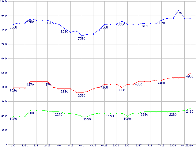PC2-6400(DDR2-800) DDR2 SDRAM DIMMの最安値推移