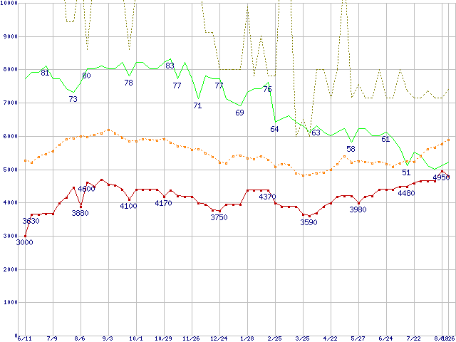 ※このグラフは過去のデータも税率5%相当に調整した税込み相当額のグラフです。 税率変更や、総額表示方式導入(2004年4月)の影響は除いています。 | | | ●凡例 | 最安値 (点線部は販売店未確認 または未調査) | 平均値 | 最高値 | ショップ数 |