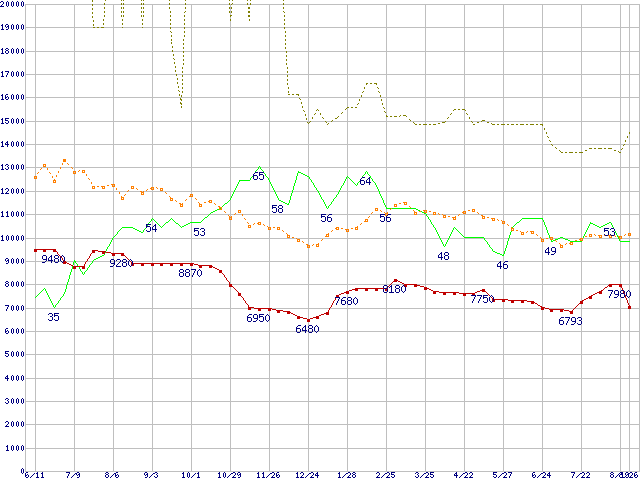 ※このグラフは過去のデータも税率5%相当に調整した税込み相当額のグラフです。 税率変更や、総額表示方式導入(2004年4月)の影響は除いています。 | | | ●凡例 | 最安値 (点線部は販売店未確認 または未調査) | 平均値 | 最高値 | ショップ数 |