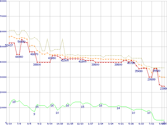| Athlon 64 4000+ (2.4GHz,L2 1MB,Socket 939)の価格推移 | | | (2005年6月10日~2006年8月25日) |