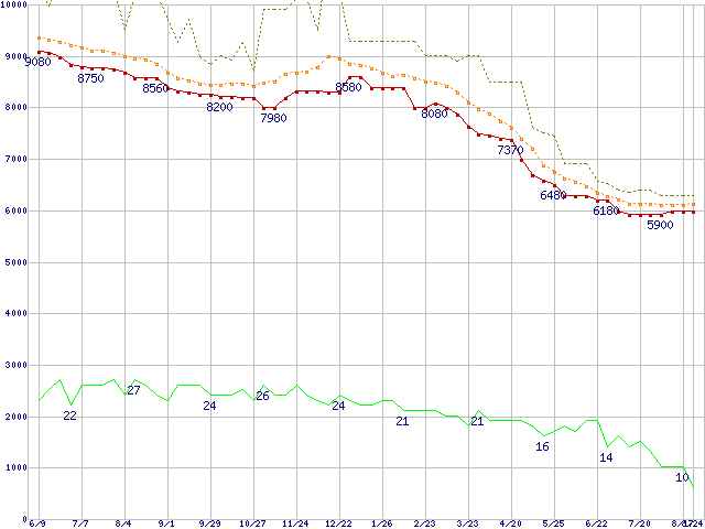 | HDT722516DLAT80 (160GB,8MB)の価格推移 | | | (2005年6月9日~2006年8月24日) |