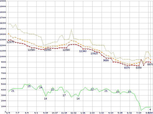 ※このグラフは過去のデータも税率5%相当に調整した税込み相当額のグラフです。 税率変更や、総額表示方式導入(2004年4月)の影響は除いています。 | | | ●凡例 | 最安値 (点線部は販売店未確認 または未調査) | 平均値 | 最高値 | ショップ数 |