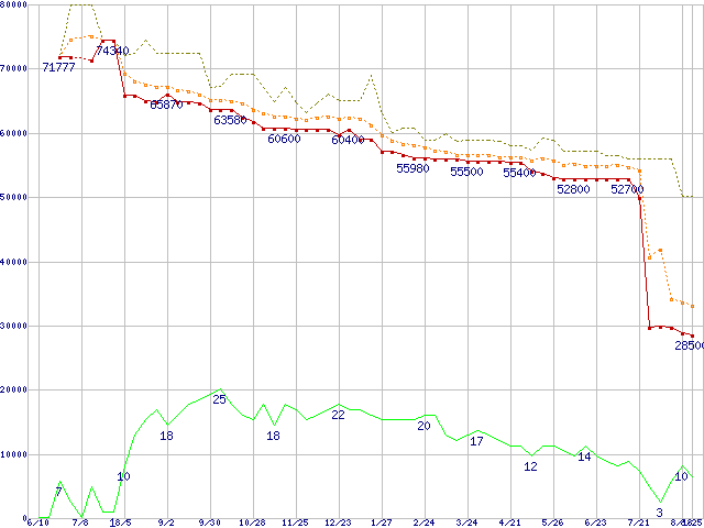 | Athlon 64 X2 4400+ (2.2GHz,L2 1MB×2,Socket 939)の価格推移 | | | (2005年6月10日~2006年8月25日) |