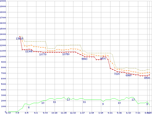 ※このグラフは過去のデータも税率5%相当に調整した税込み相当額のグラフです。 税率変更や、総額表示方式導入(2004年4月)の影響は除いています。 | | | ●凡例 | 最安値 (点線部は販売店未確認 または未調査) | 平均値 | 最高値 | ショップ数 |