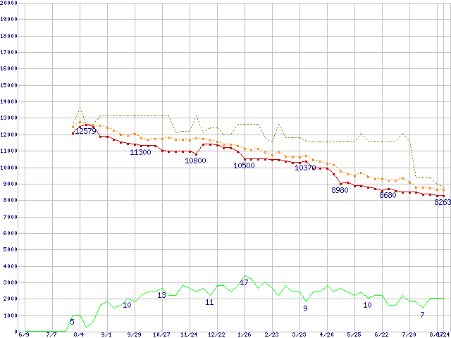 ※このグラフは過去のデータも税率5%相当に調整した税込み相当額のグラフです。 税率変更や、総額表示方式導入(2004年4月)の影響は除いています。 | | | ●凡例 | 最安値 (点線部は販売店未確認 または未調査) | 平均値 | 最高値 | ショップ数 |