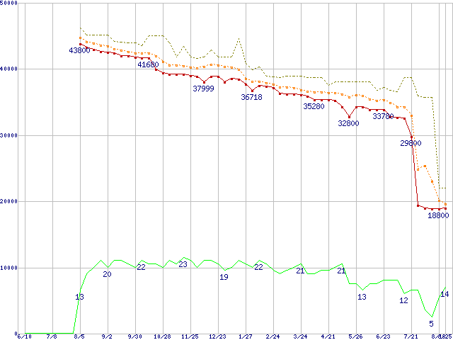 | Athlon 64 X2 3800+ (2.0GHz,L2 512KB×2,Socket 939)の価格推移 | | | (2005年6月10日~2006年8月25日) |