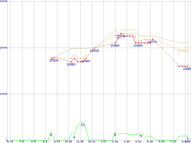 ※このグラフは過去のデータも税率5%相当に調整した税込み相当額のグラフです。 税率変更や、総額表示方式導入(2004年4月)の影響は除いています。 | | | ●凡例 | 最安値 (点線部は販売店未確認 または未調査) | 平均値 | 最高値 | ショップ数 |
