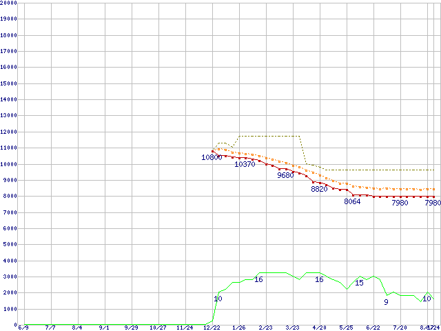 ※このグラフは過去のデータも税率5%相当に調整した税込み相当額のグラフです。 税率変更や、総額表示方式導入(2004年4月)の影響は除いています。 | | | ●凡例 | 最安値 (点線部は販売店未確認 または未調査) | 平均値 | 最高値 | ショップ数 |