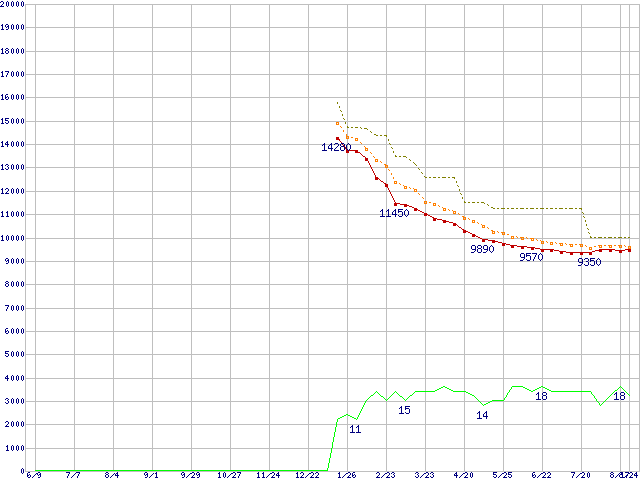 ※このグラフは過去のデータも税率5%相当に調整した税込み相当額のグラフです。 税率変更や、総額表示方式導入(2004年4月)の影響は除いています。 | | | ●凡例 | 最安値 (点線部は販売店未確認 または未調査) | 平均値 | 最高値 | ショップ数 |