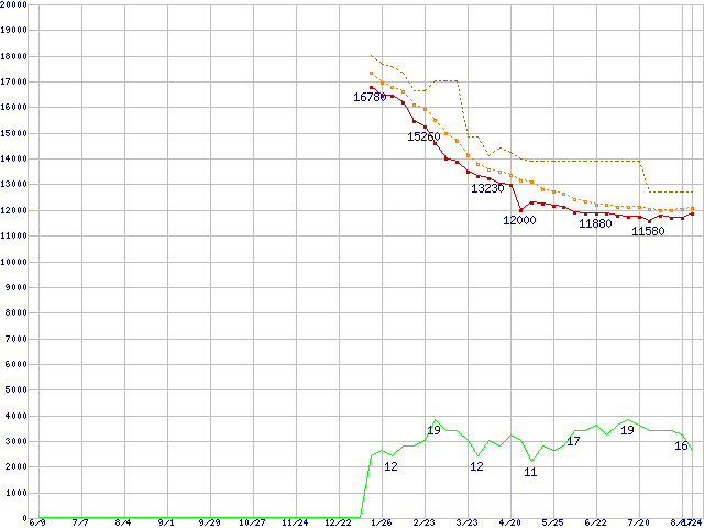 ※このグラフは過去のデータも税率5%相当に調整した税込み相当額のグラフです。 税率変更や、総額表示方式導入(2004年4月)の影響は除いています。 | | | ●凡例 | 最安値 (点線部は販売店未確認 または未調査) | 平均値 | 最高値 | ショップ数 |