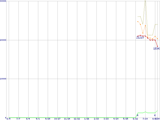 ※このグラフは過去のデータも税率5%相当に調整した税込み相当額のグラフです。 税率変更や、総額表示方式導入(2004年4月)の影響は除いています。 | | | ●凡例 | 最安値 (点線部は販売店未確認 または未調査) | 平均値 | 最高値 | ショップ数 |