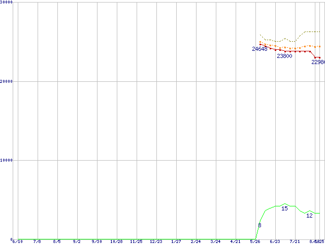 ※このグラフは過去のデータも税率5%相当に調整した税込み相当額のグラフです。 税率変更や、総額表示方式導入(2004年4月)の影響は除いています。 | | | ●凡例 | 最安値 (点線部は販売店未確認 または未調査) | 平均値 | 最高値 | ショップ数 |