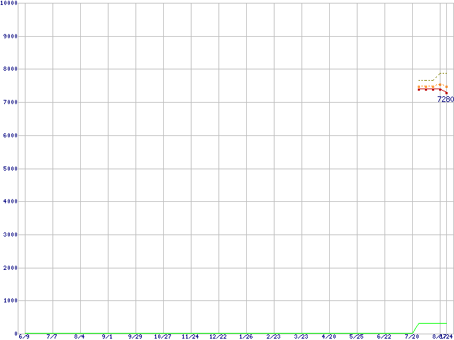 ※このグラフは過去のデータも税率5%相当に調整した税込み相当額のグラフです。 税率変更や、総額表示方式導入(2004年4月)の影響は除いています。 | | | ●凡例 | 最安値 (点線部は販売店未確認 または未調査) | 平均値 | 最高値 | ショップ数 |