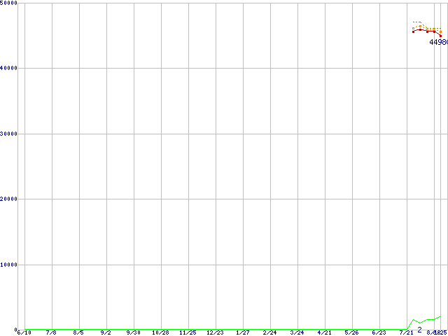 ※このグラフは過去のデータも税率5%相当に調整した税込み相当額のグラフです。 税率変更や、総額表示方式導入(2004年4月)の影響は除いています。 | | | ●凡例 | 最安値 (点線部は販売店未確認 または未調査) | 平均値 | 最高値 | ショップ数 |