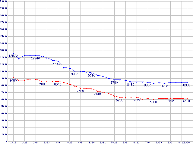 | Deskstar T7K250 (7200rpm,Serial ATA II/3Gbps)の最安値推移 | | | (2006年1月12日~2006年8月24日) |