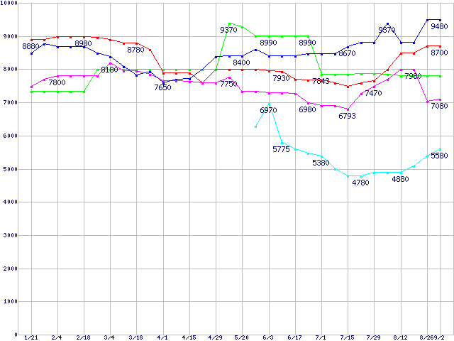 メモリ主要製品(最安値5千円~1万円未満)の最安値推移