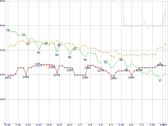※このグラフは過去のデータも税率5%相当に調整した税込み相当額のグラフです。 税率変更や、総額表示方式導入(2004年4月)の影響は除いています。 | | | ●凡例 | 最安値 (点線部は販売店未確認 または未調査) | 平均値 | 最高値 | ショップ数 |