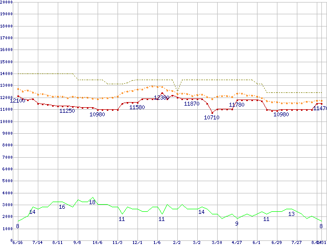 ※このグラフは過去のデータも税率5%相当に調整した税込み相当額のグラフです。 税率変更や、総額表示方式導入(2004年4月)の影響は除いています。 | | | ●凡例 | 最安値 (点線部は販売店未確認 または未調査) | 平均値 | 最高値 | ショップ数 |